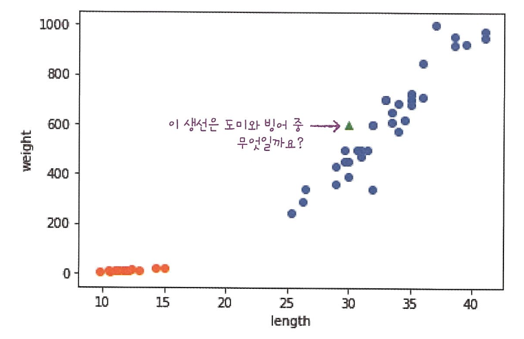 여기서는 k-최근접 이웃(k-Nearest Neighbors) 알고리즘을 사용해 도미와 빙어 데이터를 구분할 것이다.