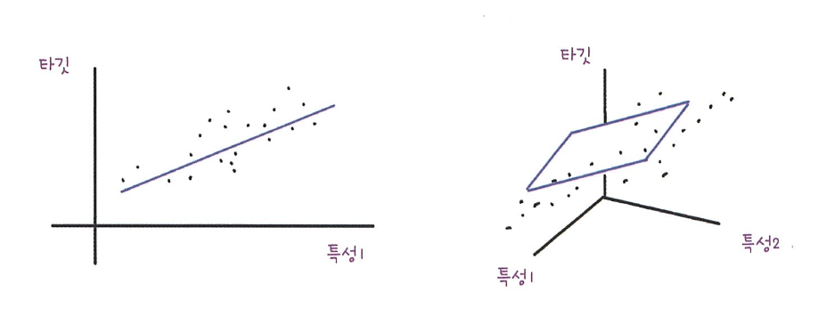 여러 개의 특성을 사용한 선형 회귀를 다중 회귀(multiple regression)라고 부른다. 1개의 특성을 사용할 때 선형 회귀 모델은 직선을 학습하고, 2개의 특성을 사용하면 선형 회귀는 평면을 학습한다.