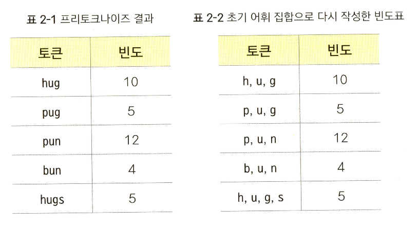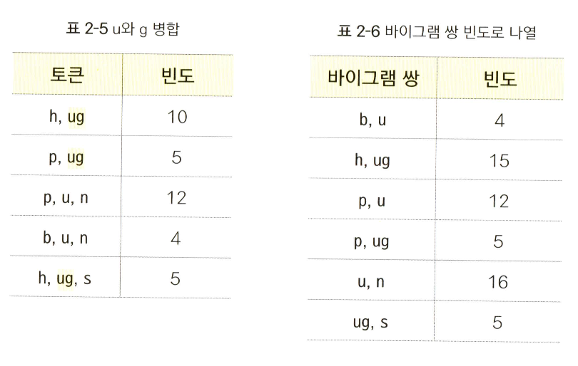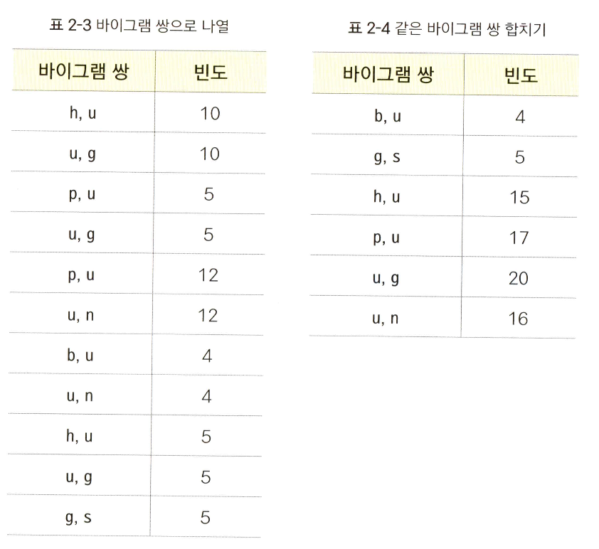 u, g를 병합했으므로 표 2-2의 각 빈도는 그대로인 채 hug, pug, hugs가 다음과 같이 바뀐 것을 확인할 수 있다.