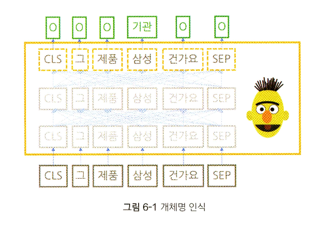 다만 개체명 인식 모델은 토큰 각각을 개체명 확률로 내어 주므로 실제로는 다음과 같은 구조가 된다. 이렇게 만든 모델의 최종 출력과 정답 레이블을 비교해 모델 출력이 정답 레이블과 최대한 같아지도록 BERT 레이어 전체를 포함한 모델 전체를 업데이트한다.