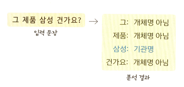 개체명 인식이란 문장을 토큰화한 뒤 토큰 각각에 인명, 지명, 기관명 등 개체명 태그를 붙여 주는 과제이다. 그 예시로, 아래와 같이 '그 제품 삼성 건가요?'라는 입력 문장이 있을 때, '삼성'에 기관명이라는 태그를 붙여 줄 수 있다.