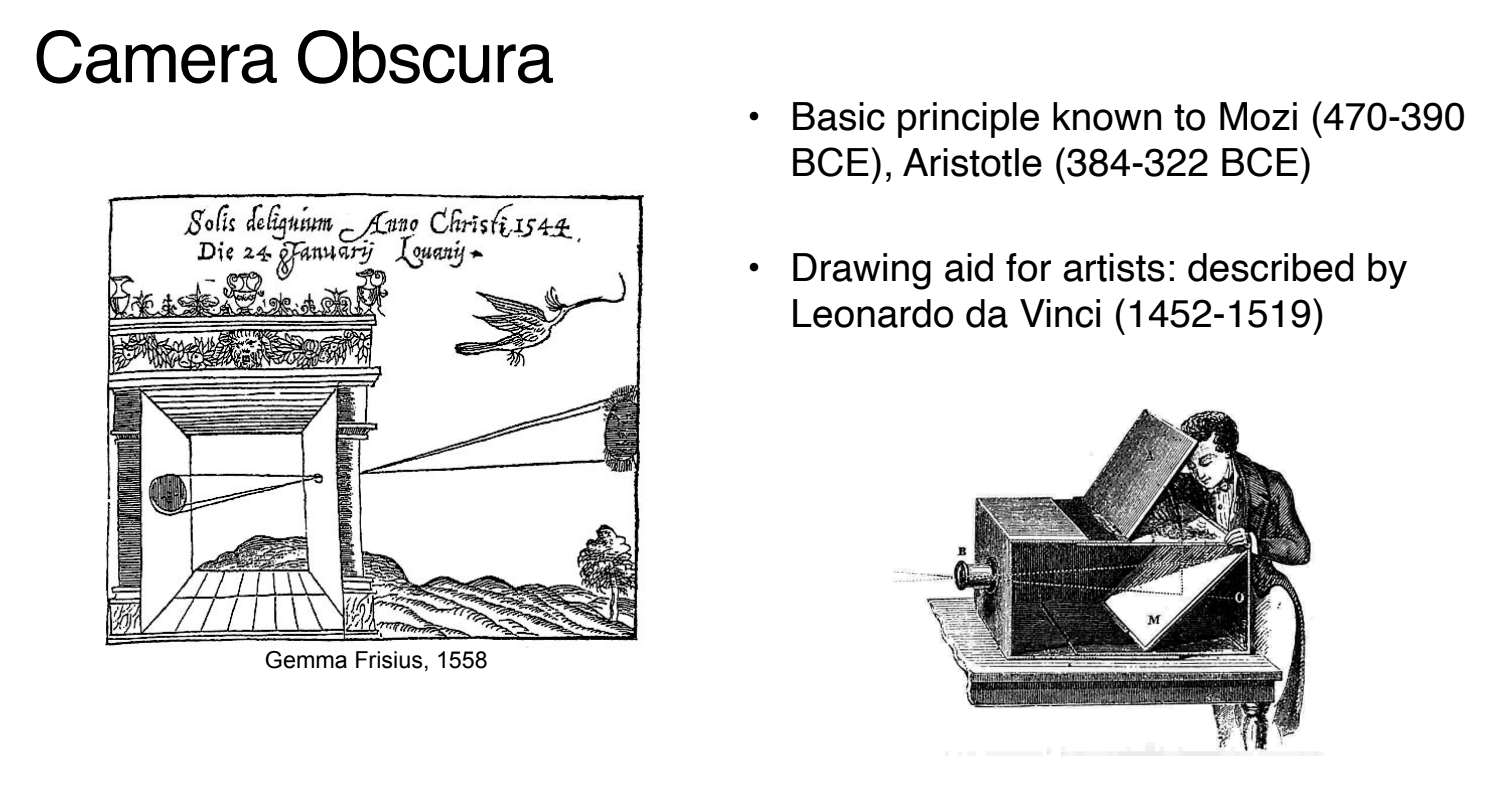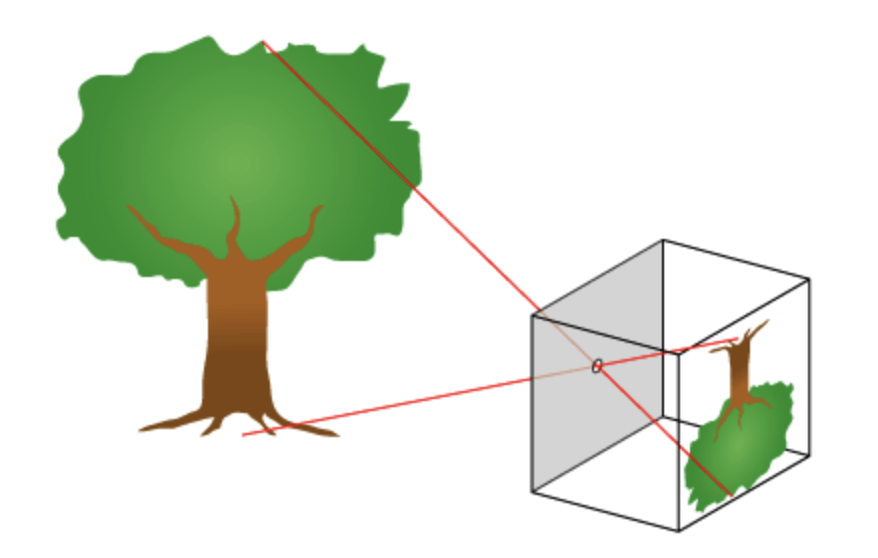 - camera(room)+obscura(어두운)으로, 어두운 방의 한 부분에 구멍을 뚫어 놓으면 밖의 풍경이 구멍을 통해 들어와 맞은편 벽에 거꾸로 맺히게 되는 장치