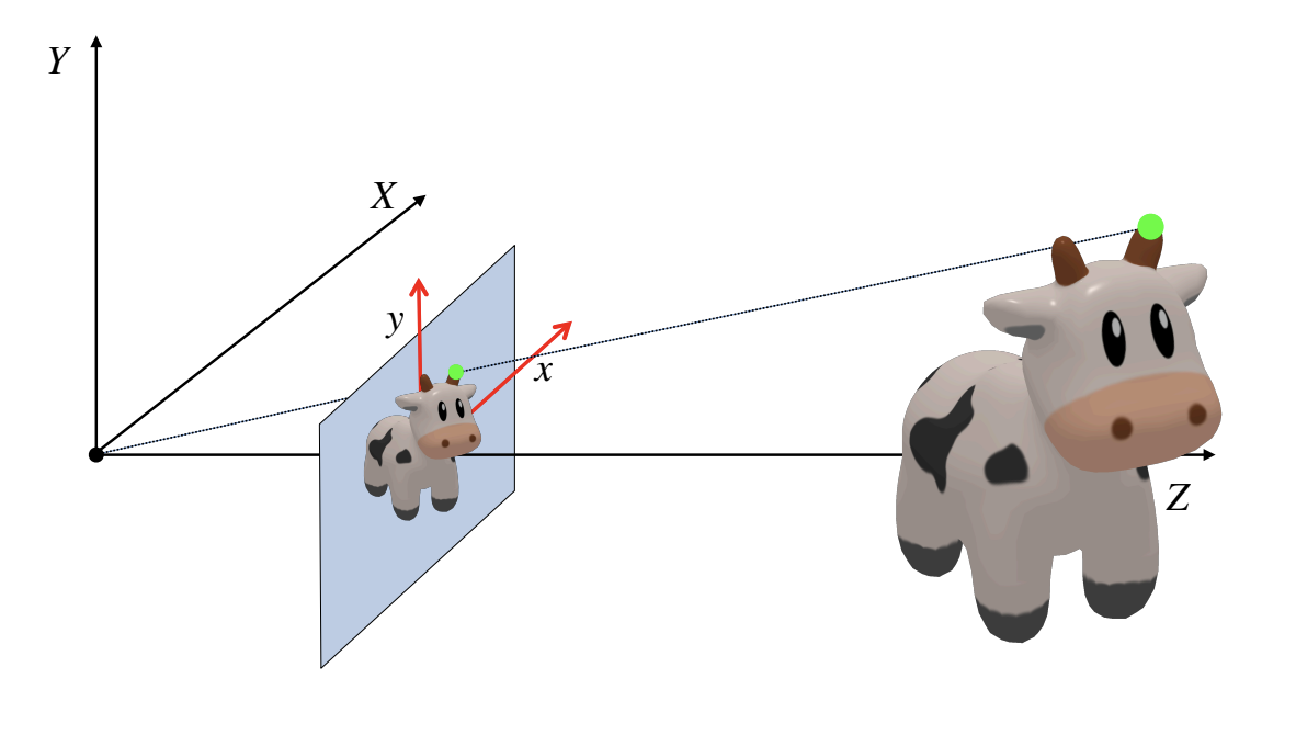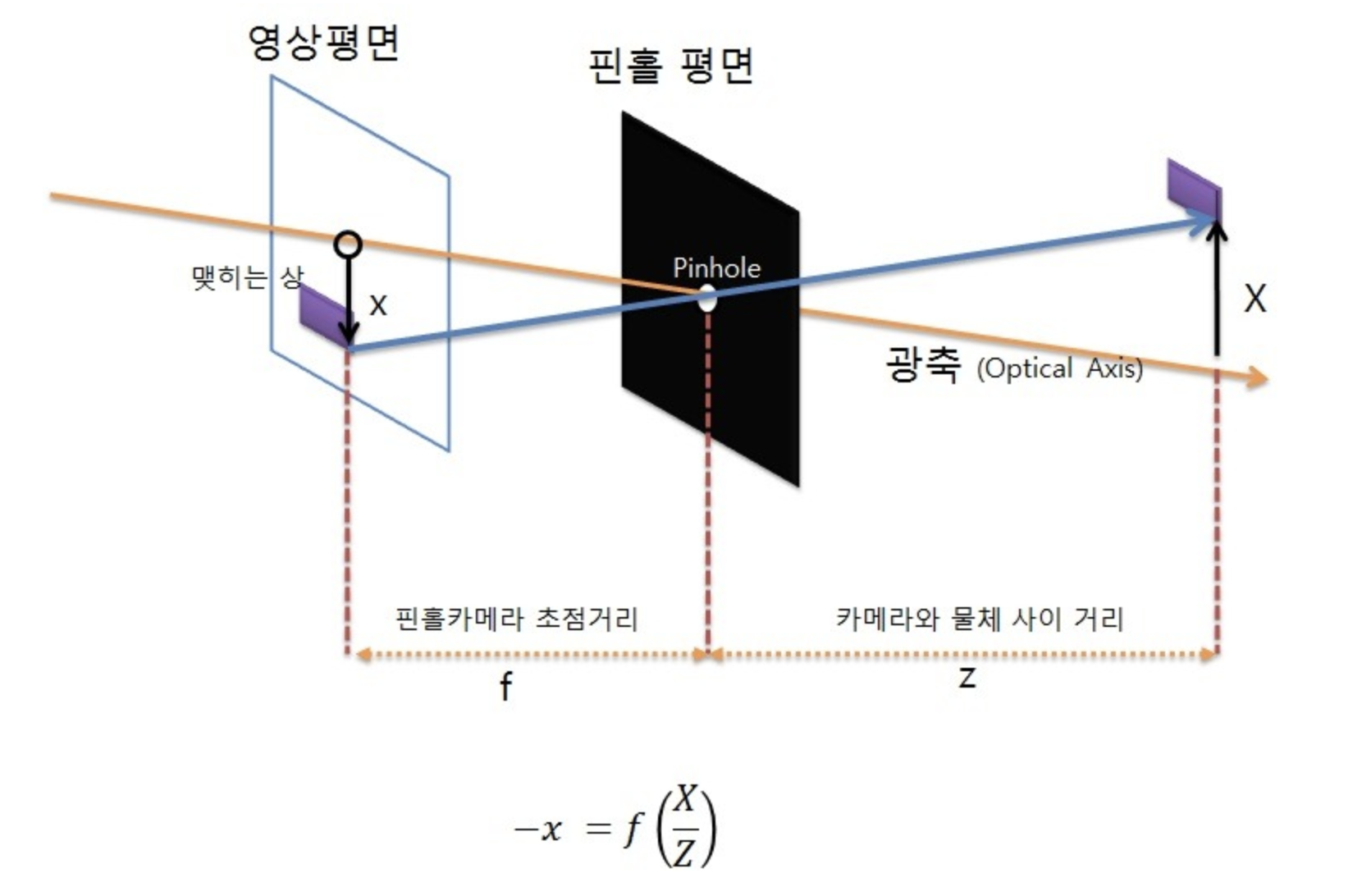 - 물체에서 반사된 광선 중 하나가 핀홀을 통과하게 되면, 그 광선은 영상 평면에 도달하게 됨 → 그 위치에 실제 물체의 상이 맺히게 되고, 물체의 크기는 핀홀 카메라의 초점거리에 의해 결정됨