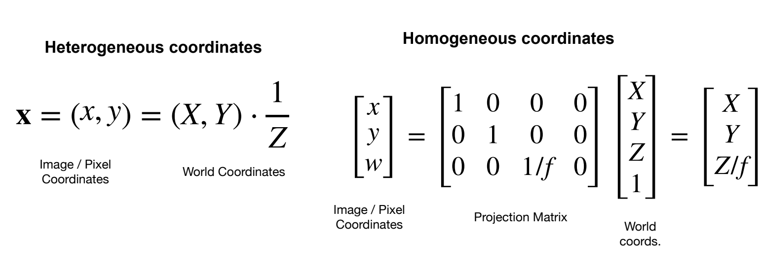 - homogeneous coordinates를 사용하여 3d 좌표를 2d 좌표로 변환할 수 있음