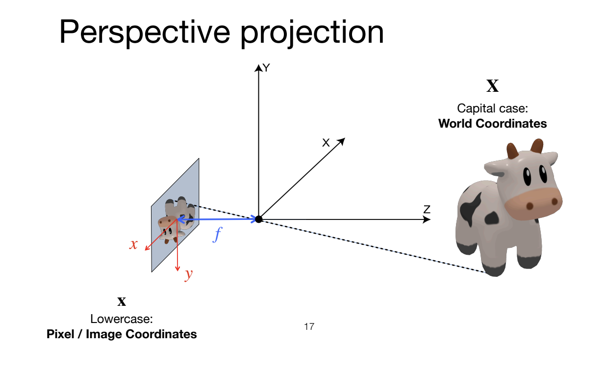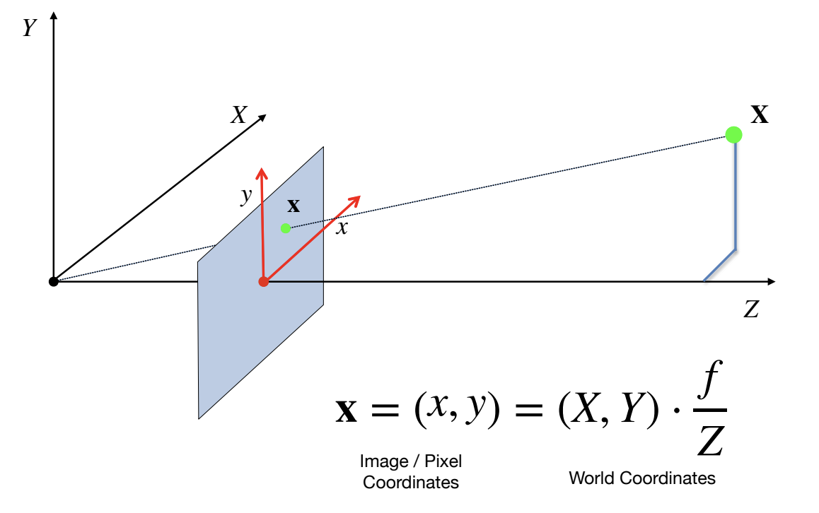 - 카메라 앞 2d plane에 만들어진 image는 pixel coordinates의 거리 f와 동일한 거리를 가지고 상을 만들게 됨