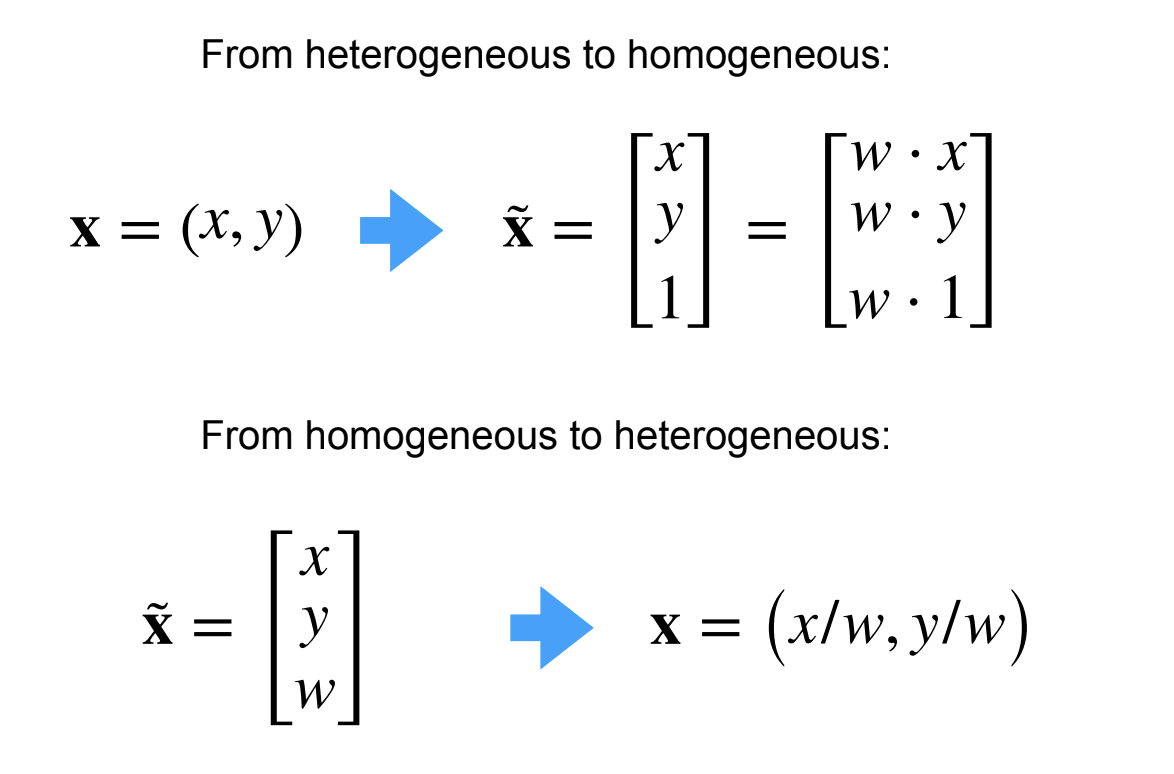 - 임의의 0이 아닌 상수 w에 대해 (x,y)를 (wx, wy, w)로 표현해냄