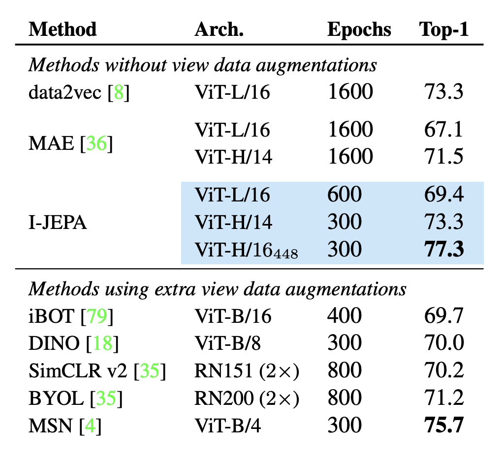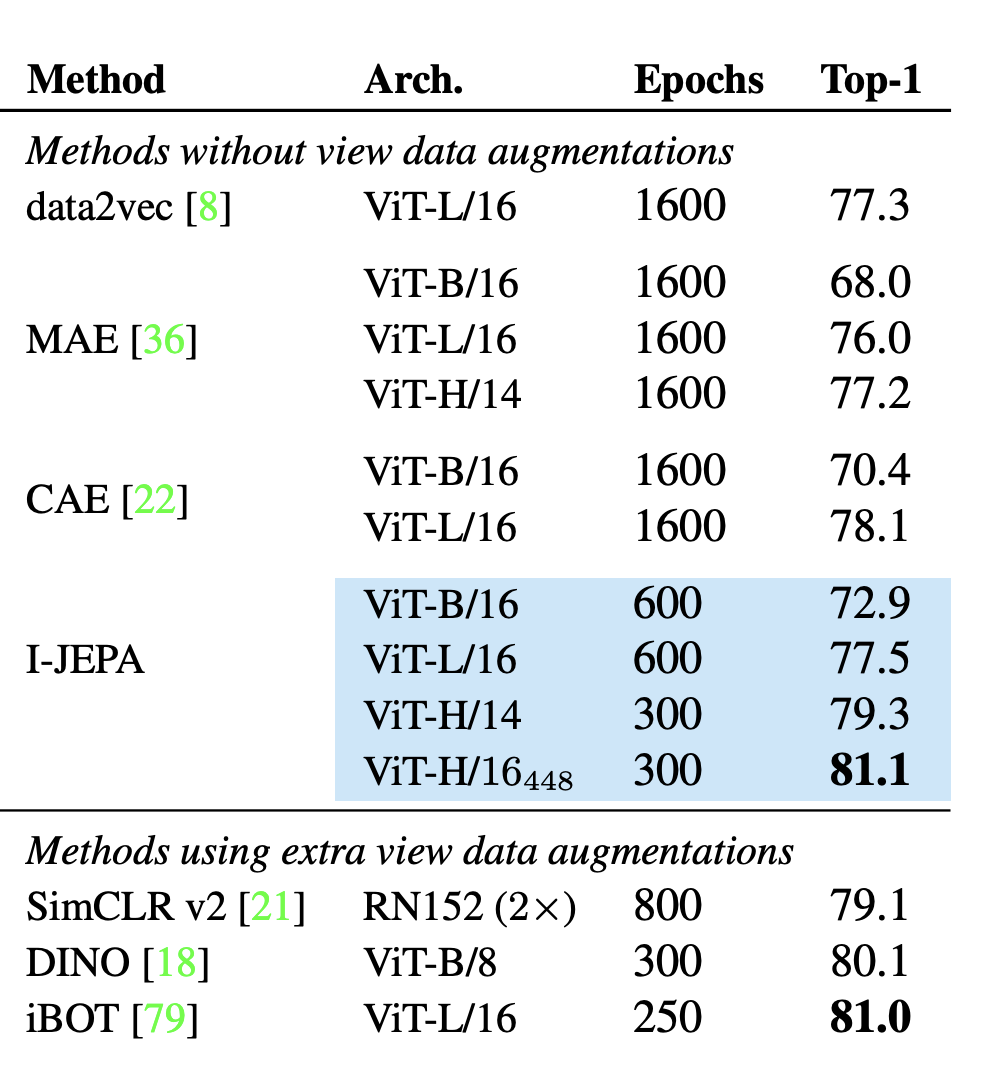 본 논문에서는 hand-crafted data-augmentations에 의존하지 않고 highly semantic image representations을 학습하는 방법, I-JEPA(Image-based Joint-Embedding Predictive Architecture)을 제안.